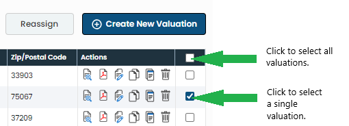 - On the Valuation dashboard, click the check box in the far right column to select a valuation. After you select a valuation, the Reassign button appears.
